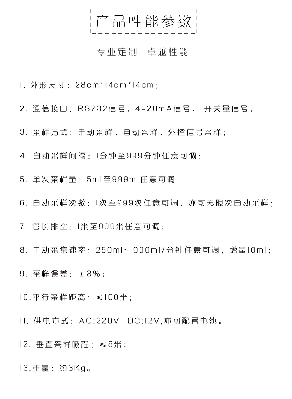儀器采用可靠蠕動泵,混合式步進(jìn)機(jī)驅(qū)動,滿足各類環(huán)境條件下的水質(zhì)采樣。適用于各*環(huán)境監(jiān)測站、污水處理廠、水利、水務(wù)及科研院所,對工業(yè)污水排放口、江、河、湖、海等水樣的采集。