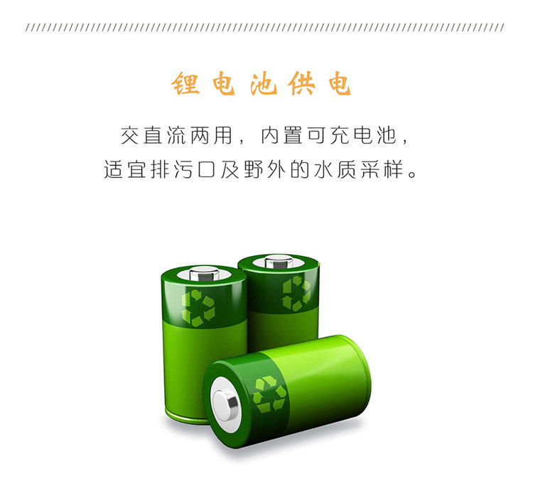 5、交直流兩用,內置可充電池,適宜排污口及野外的水質采樣;