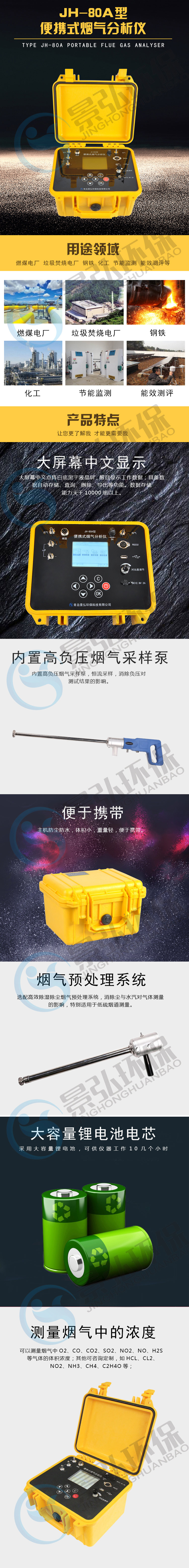 JH-80A型便攜式煙氣分析儀主要采用NDIR非分光紅外和電化學技術,用于直接測量煙氣中的O2、CO、CO2、SO2、NO2、NO、H2S等氣體的濃度(其他可咨詢定制,如HCL、CL2、NO2、NH3、CH4、C2H4O等)。配套測溫一體化采樣槍,同時測量煙氣溫度、煙氣壓力及流速等參數。該產品的主要特點是精度高、體積小、攜帶方便、操作簡單,主要應用于燃煤電廠、垃圾焚燒電廠、鋼鐵、化工、節能監測、能效測評、燃燒研究等領域。