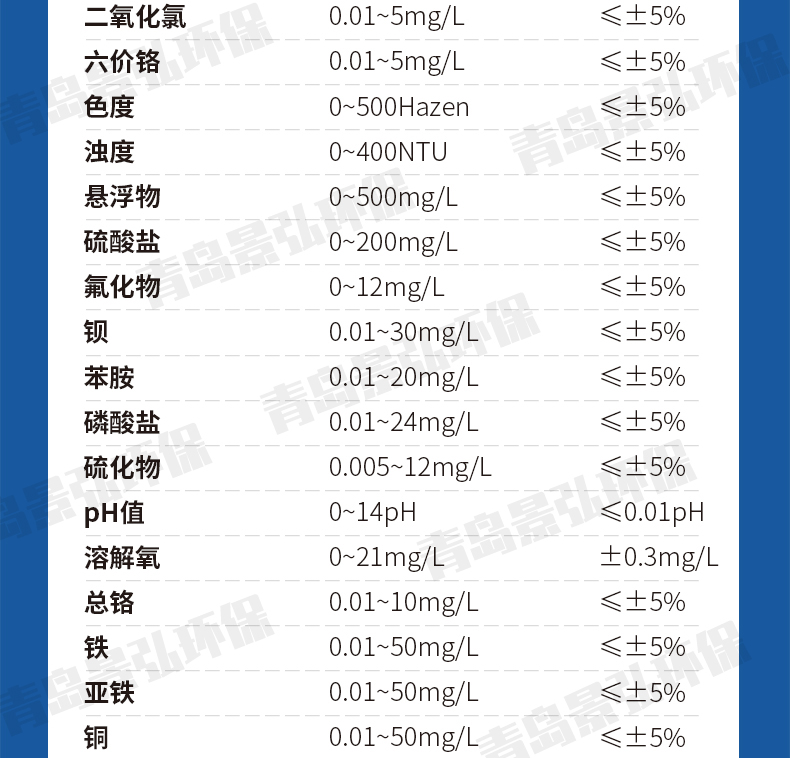 ② 測定范圍:0.01mg/L~5mg/L(>5mg/L時分段測定,超量程可稀釋測量);