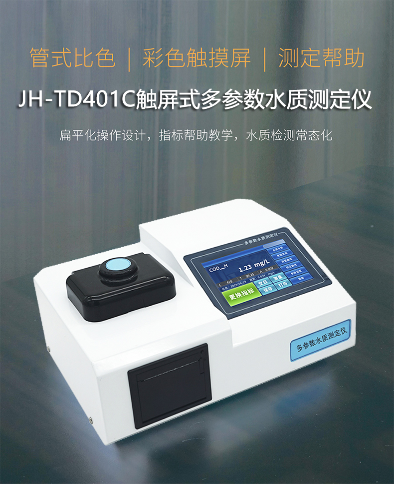 JH-TD401C型彩色觸摸屏多參數水質測定儀采用觸控式設計,全中文操作界面,引導式系統操作,精巧的整機設計結合高強度耐腐蝕外殼,提升了用戶的使用及操作體驗。消解比色一體管設計,預存指標參數曲線,使整個檢測過程更加簡單便捷,更易于使用者上手操作。可廣泛應用于環保環境監測、科研水質檢測、生產排放監察檢測等領域。