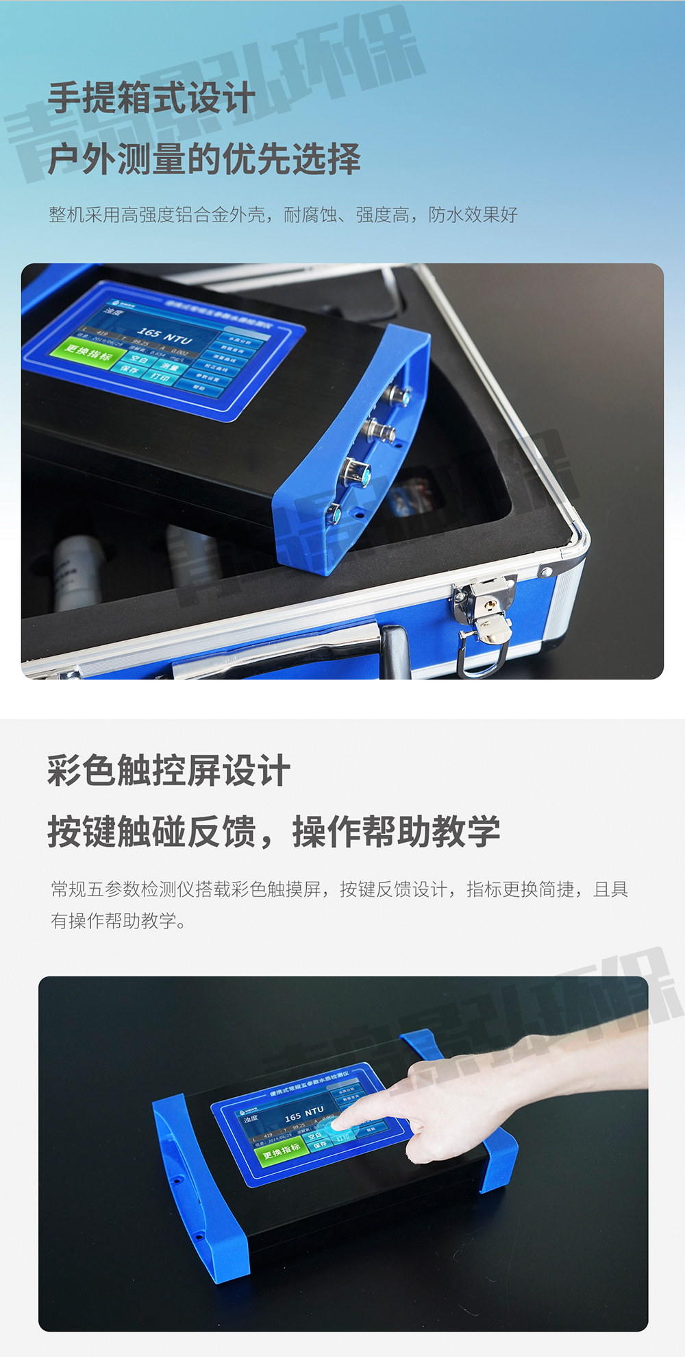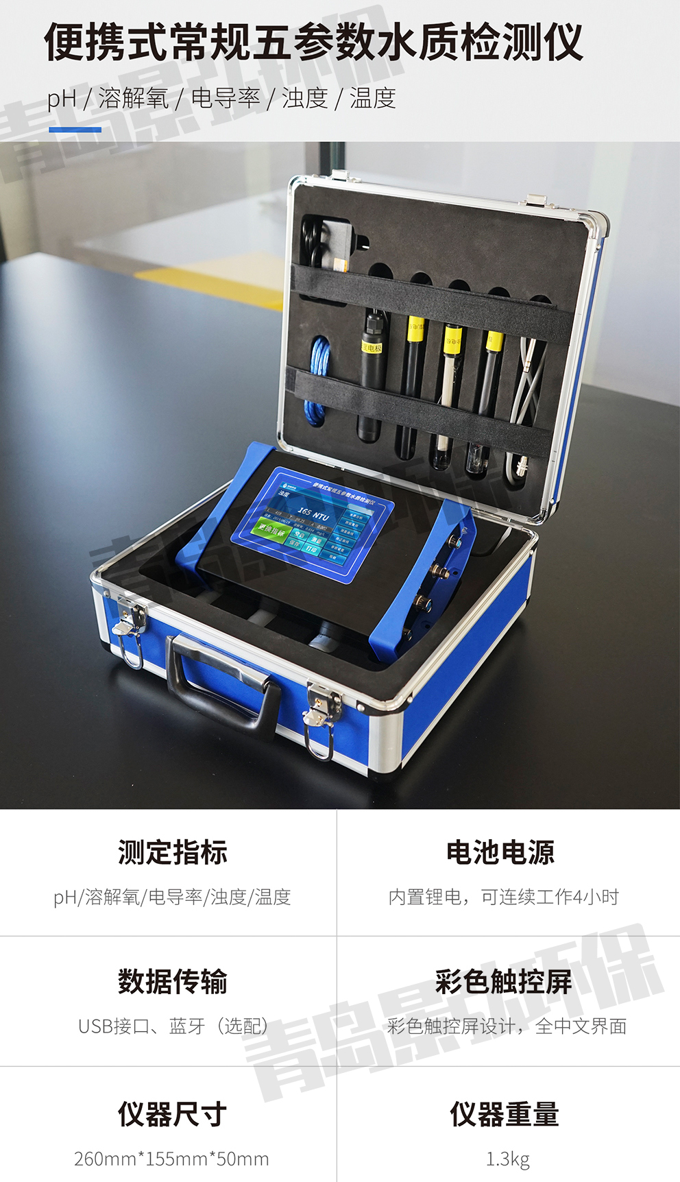 2、 儀器設計小巧輕便,內置大容量鋰電池,方便野外水質測定操作;